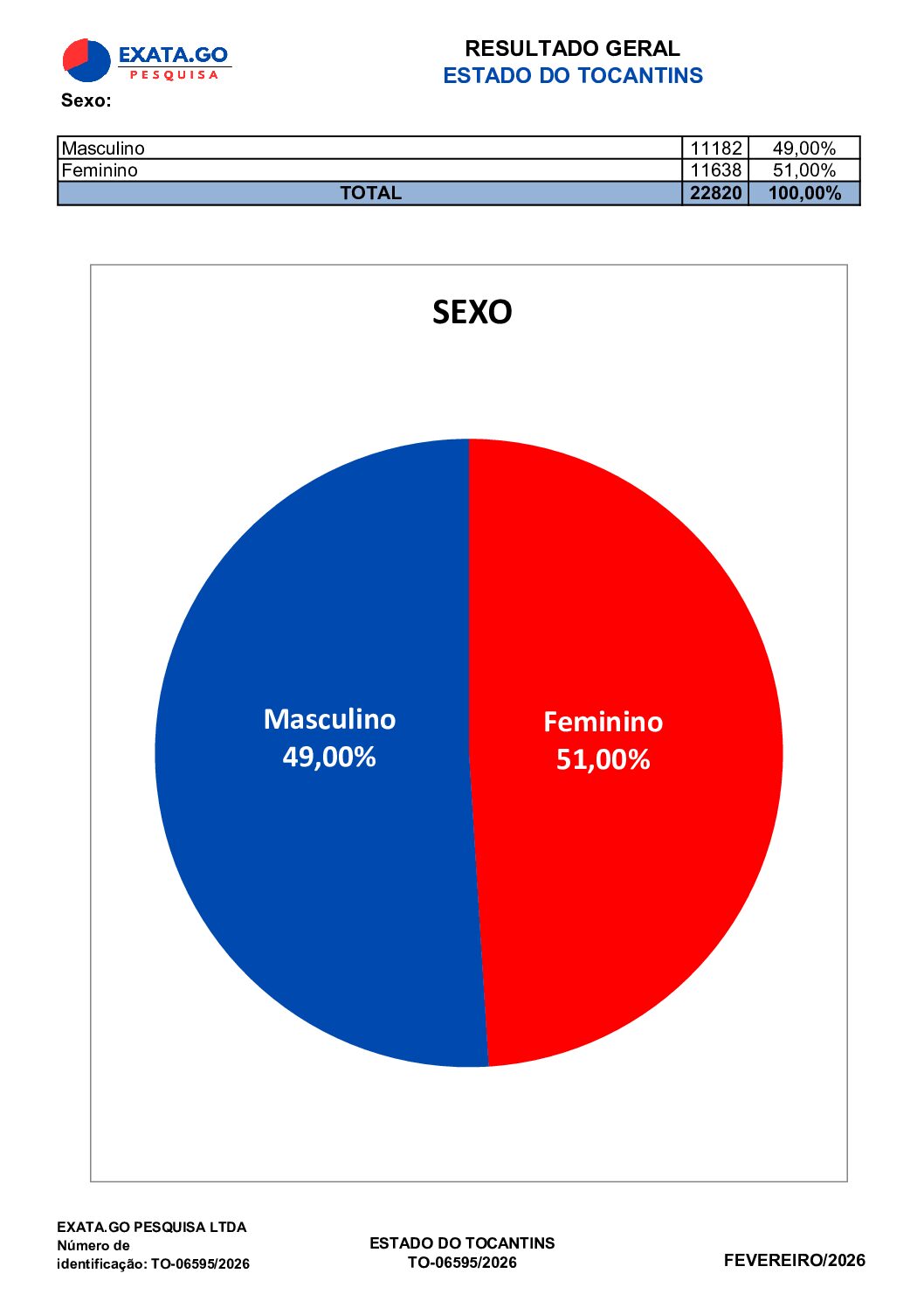 A Exata.GO Pesquisa divulgou nesta quinta-feira, 12, levantamento eleitoral realizado entre os dias 12 e 30 de janeiro, período em que ouviu 22.820 eleitores das mais diversas regiões do Estado. A margem de erro é de 3,47 pontos percentuais para mais ou para menos, com nível de confiança de 95%. A pesquisa foi registrada no Tribunal Regional do Tocantins (TRE-TO) — número TO-05781/2026.